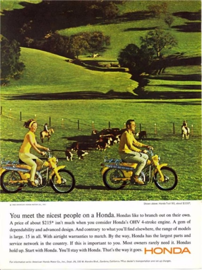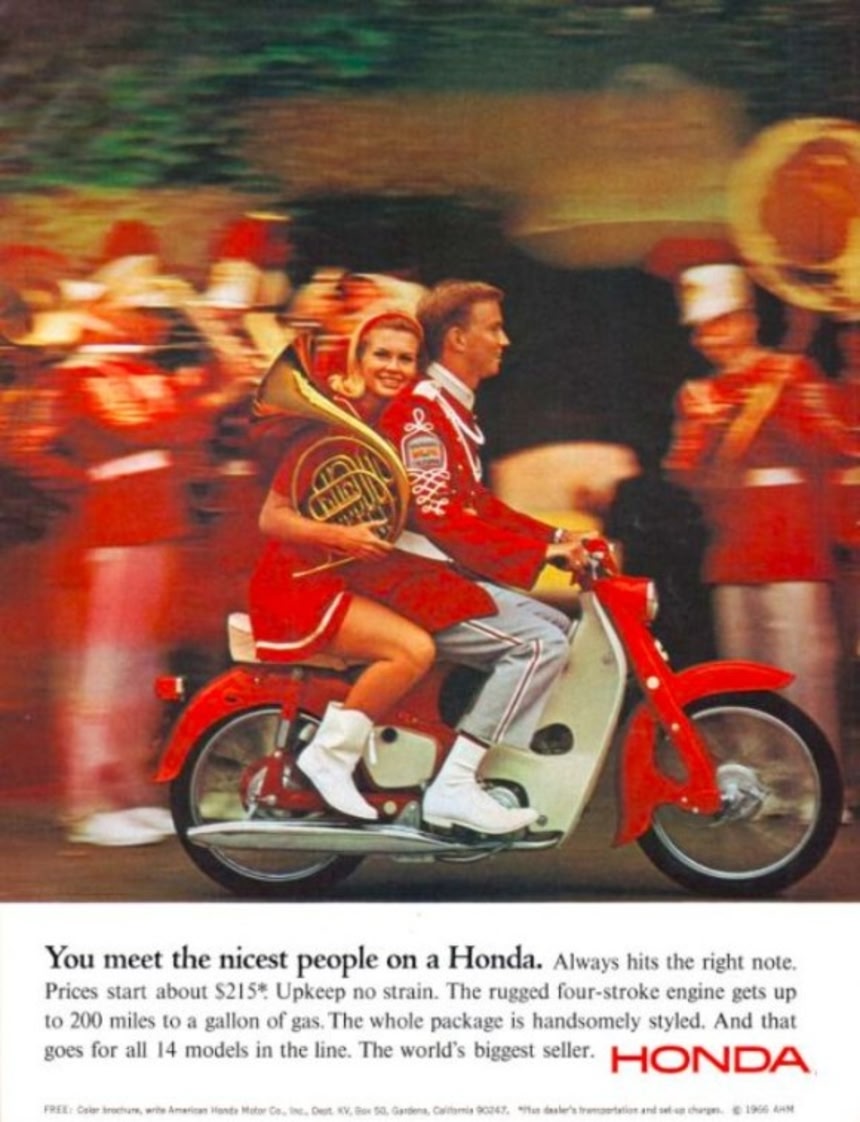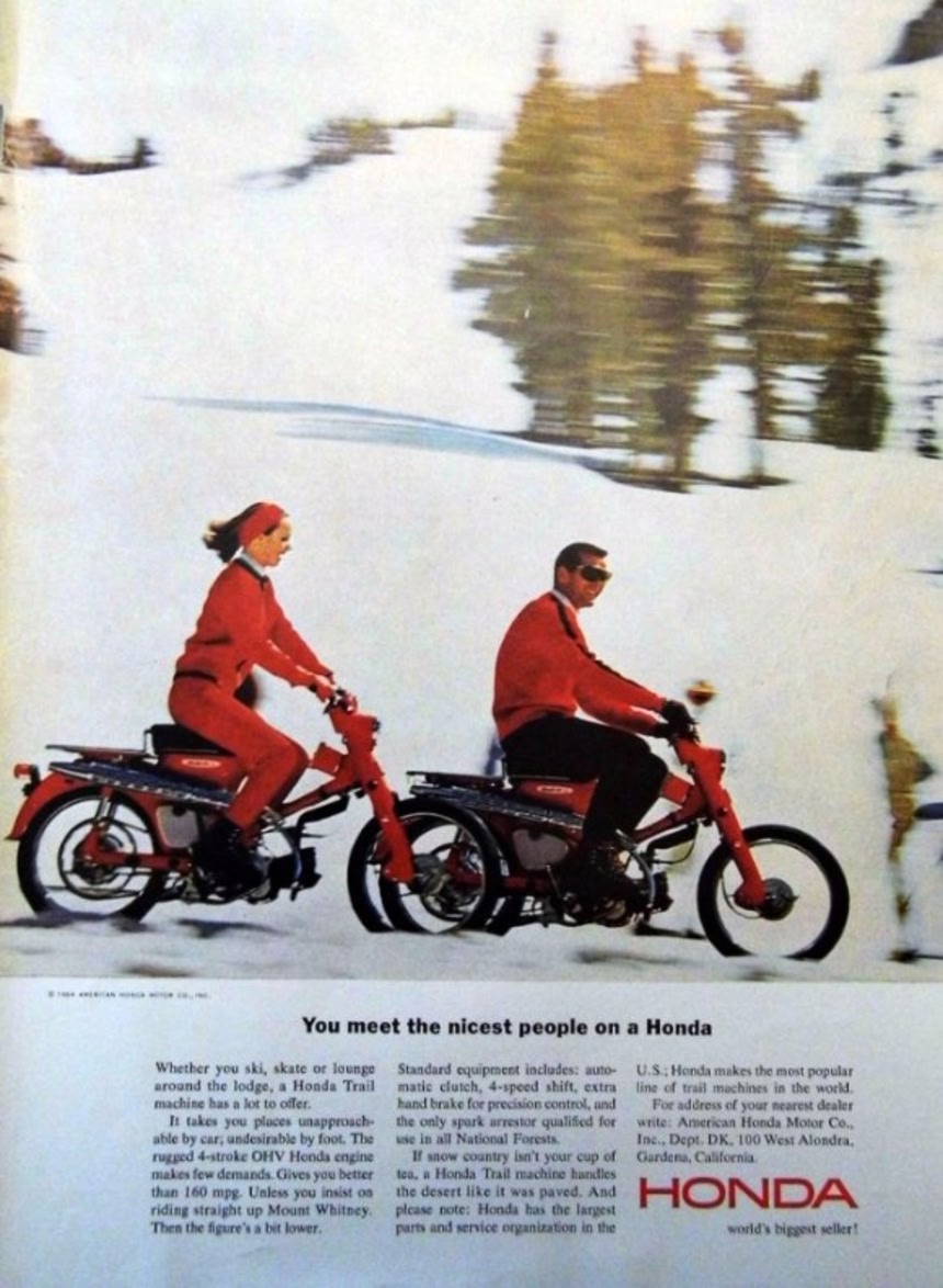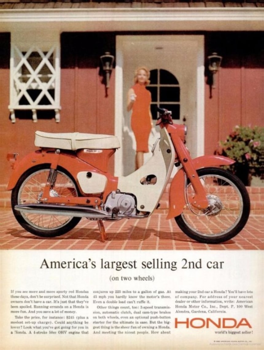 1961年には多額の広告費を投じて、「ナイセスト・ピープル・キャンペーン」を展開。コンパクトでパワフルなスーパーカブは、1965年にはアメリカのオートバイの市場をほぼ独占したという。