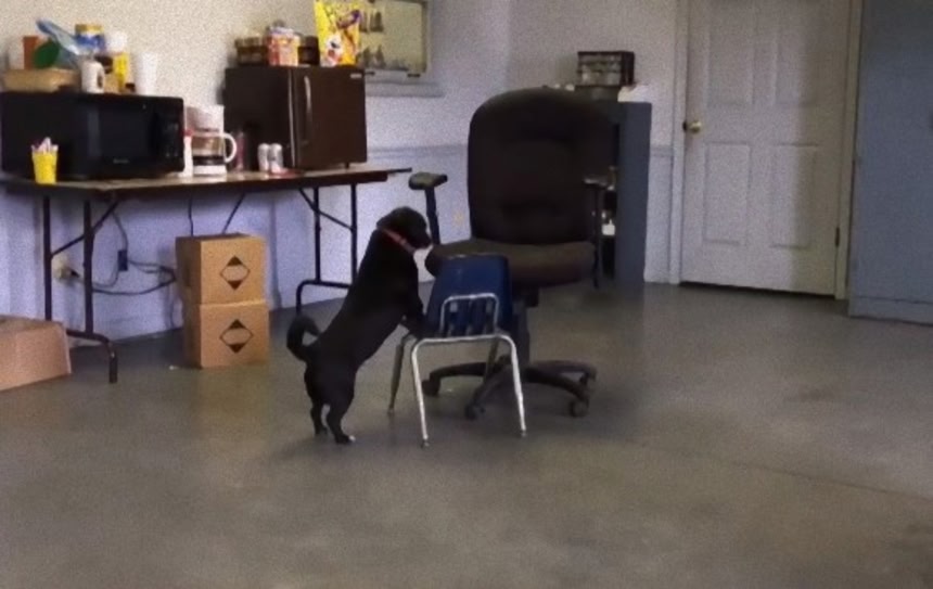 ひじ掛け付きの大きな椅子にどうしても座りたかった黒い犬。だがそのままジャンプして座ることはできない。そこで犬は考えた。