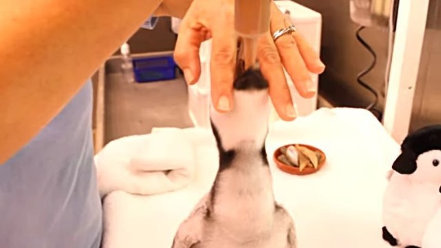 日本の動物園などでは、ペンギンの赤ちゃんには魚やオキアミ、ミルク、ビタミン剤なんかを混ぜてミキサーにかけたものをあげているようなので、この動画でも似たようなものを食べさせていると思われる。