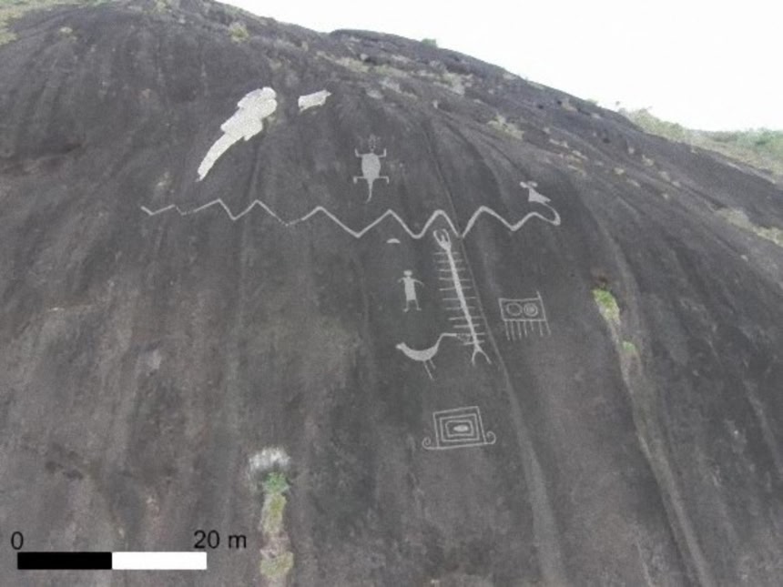ここに彫られているモチーフは、ブラジル、コロンビアやもっと離れた場所など、この地域で見られるほかの岩絵とよく似ているという。