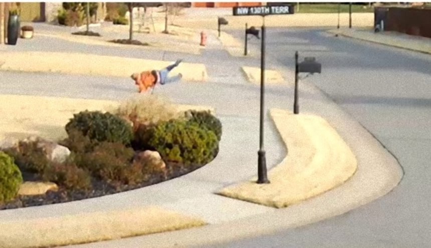 郵便ポストに激突して車から転落、更にすっころぶ。その姿が監視カメラから全世界に配信される
