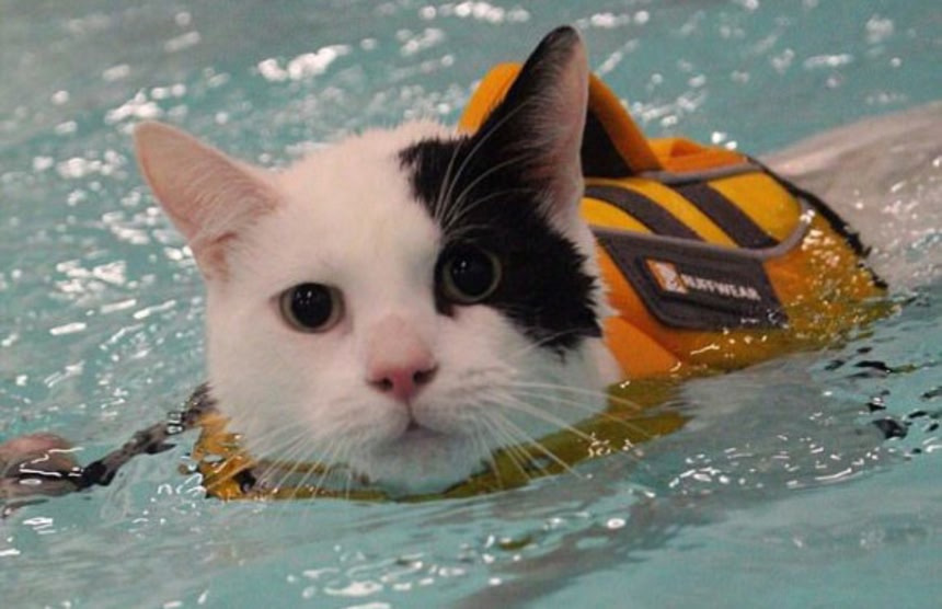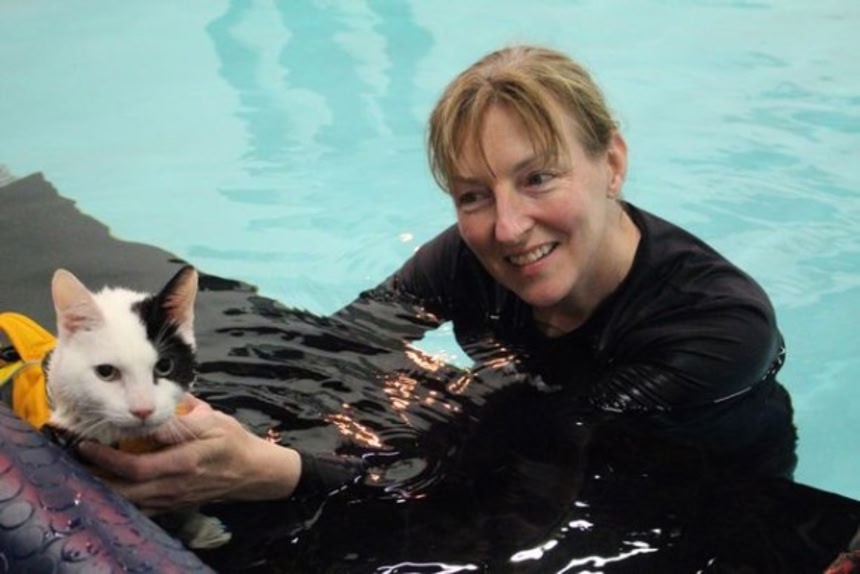 この画像を大きなサイズで見るほとんどの犬はあっという間に泳ぎ始めるため、セラピーは犬にとって遊びと同じでそばにいても泳いで遊んでいるだけだ。だが猫はかなり違った。