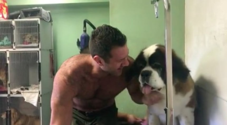 ビビりまくるリリーさんになんとか快適に、ストレスなくグルーミングを受けてもらいたい。そう考えたリーさんは上半身裸になって自分も施術台に上がった。