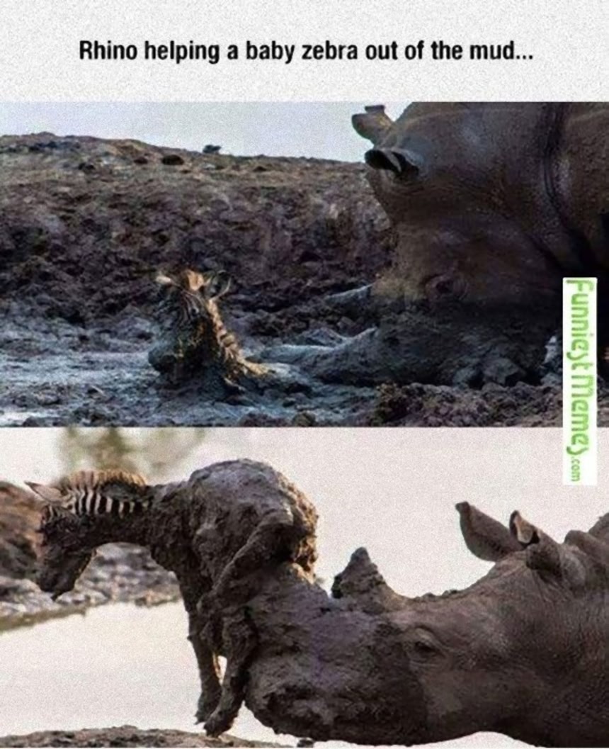 4.泥に落ちたシマウマの子どもを助けるサイ