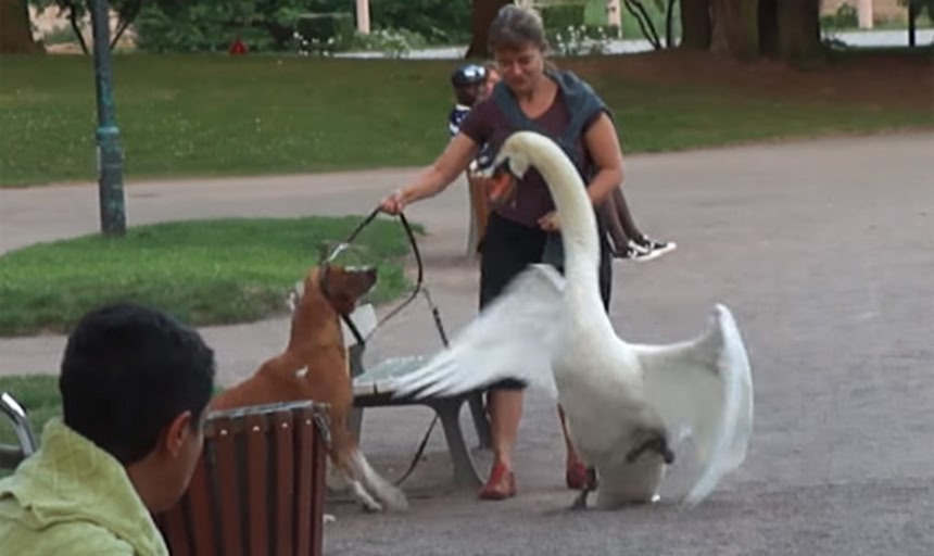 その映像は、何が気に食わなかったのかわんこに狙いを定めた白鳥(コブハクチョウ)と、それを阻止しようとする飼い主の緊張状態をとらえていた。