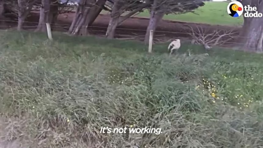 バイクで道路を走っていた撮影者さん。道路わきの有刺鉄線に、1頭のヒツジが引っかかっているのを発見した。