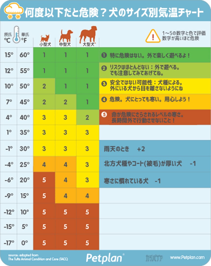 このチャートは、「ペットプラン」の獣医師が作成したもので、アメリカのタフツ大学が気候条件による犬の反応から作った指標をモデルにしているそうだ。大型犬、中型犬、小型犬に分類されており、冬場の犬のお散歩の簡単な目安になるという。