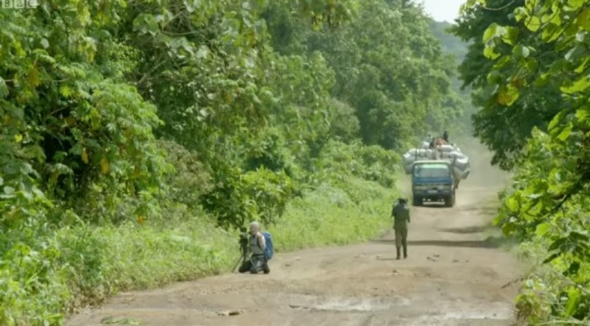 ゴリラの群れは道路を横断して向こう側に行きたかった。だがその時トラックがやってきた。群れに緊張が走った。更に20分後、またトラックがやってきた。なかなか道路を渡れないゴリラたちを助けるため、撮影クルーはトラックに止まってもらうようお願いした。