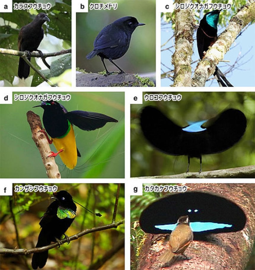 この画像を大きなサイズで見るフウチョウ科の仲間でもすべてが超黒の羽をもつわけではない。(a)(b)は普通の黒の羽だが、(c)(d)(e)(f)(g)は超黒の羽をもつ