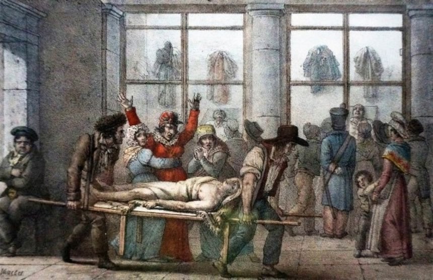 この画像を大きなサイズで見るモルグの中を運ばれる死体(1840年頃)