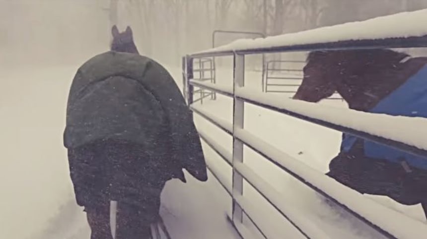 雪の中、厩舎から出て歩き始めた2頭のおウマさんたちだったが…。
