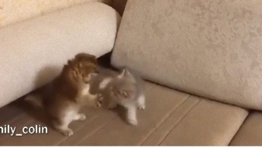 ソファの上で始まったミニチマ毛玉たちのふわふわな争いじゃれあい