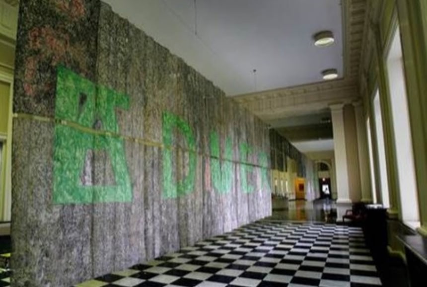ダートマスの学生、教職員、地元の住民の髪の毛を集めるのに、数ヶ月かかった。”グリーン・ハウス”という作品タイトルと、金を象徴するグリーンの文字で、教育と資本主義は分離できないものであることを示している。