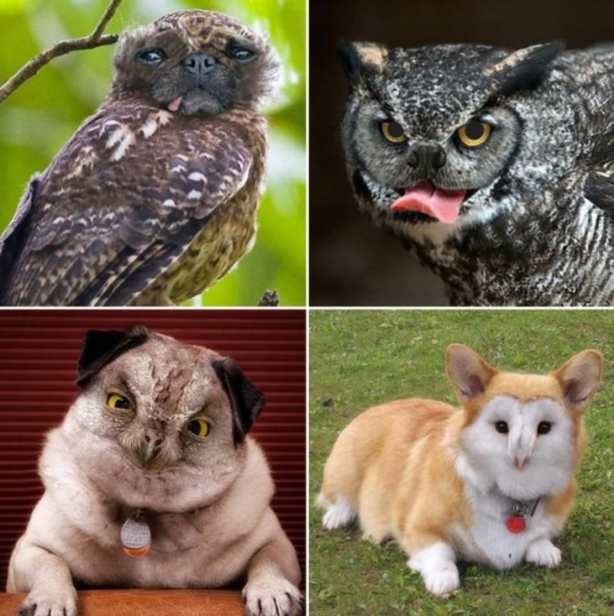 そこでコラ職人たちは、かわいさでは猫と双璧を誇る犬とフクロウを合体させることにしたようだ。で、あれだ。目指す方向性が違っていた職人さんもいたのかもしれない。かわいく仕上がったものもあるにはあるんだけど、違う、そっちじゃない!的な出来栄えのものもあったようだ。