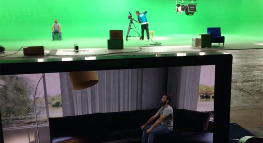 この先端技術によって、大きな緑色の背景と自動追跡カメラ、そして制御用のコンピューターがあれば、監督は撮影中でもモニター越しに俳優と合成された映像をチェックできる。