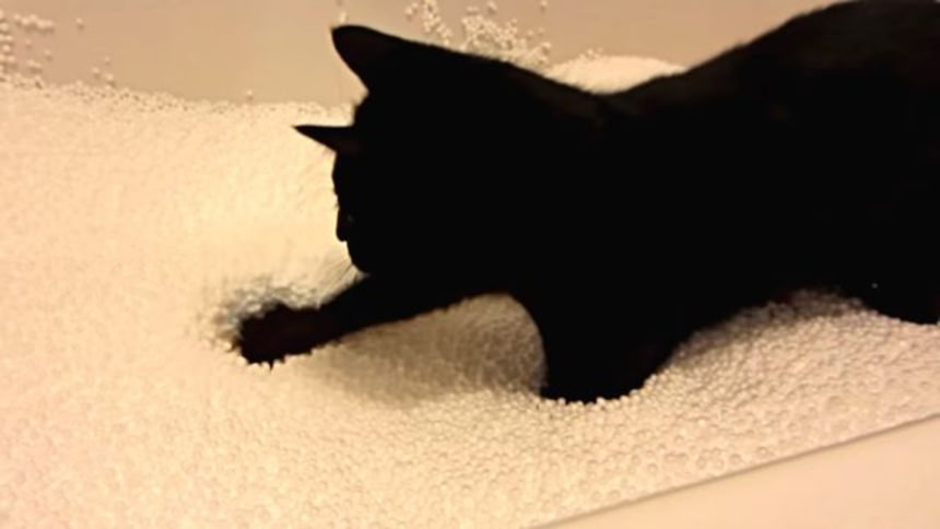 この画像を大きなサイズで見る何やら楽しそうだと思ったのか、こちらのお宅の黒猫ちゃんがビーズの中に埋まりながらも、オモチャを追いかけ始めたぞ。