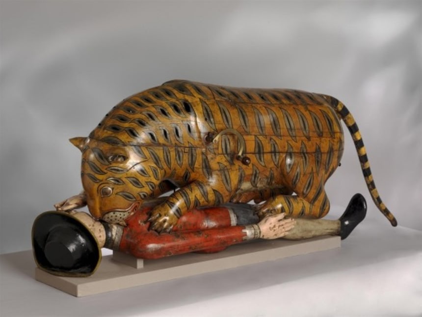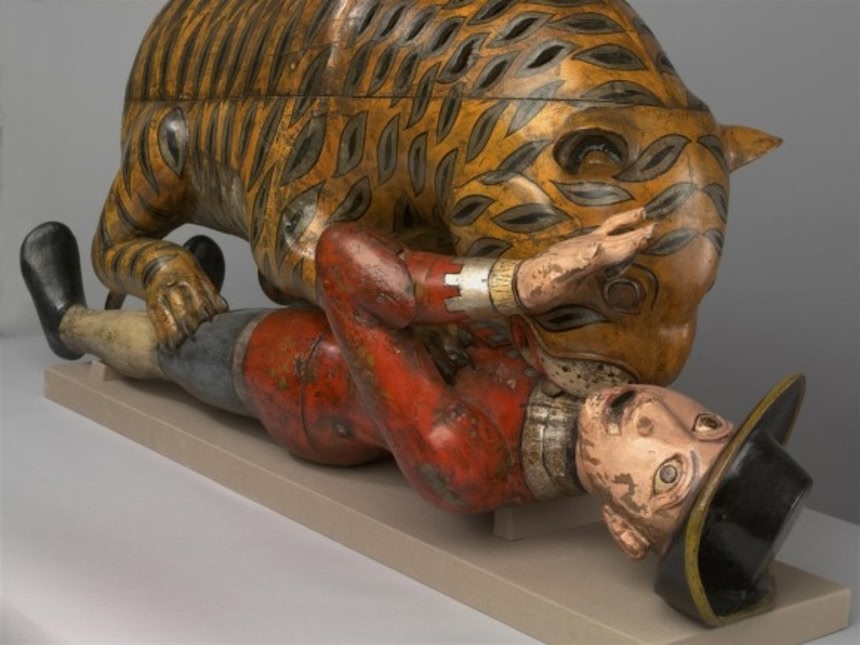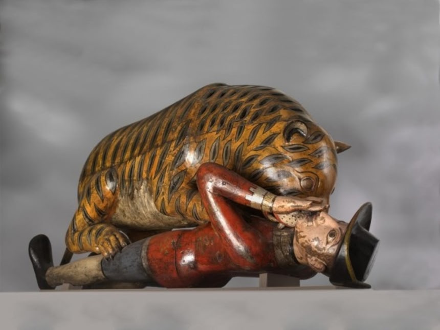 この画像を大きなサイズで見る等身大ほどある西洋風の服を着た男の上には大きなトラ。トラは男の首元にかぶりついている。これは機械仕掛けの木製のオートマタ(自動楽器)である。