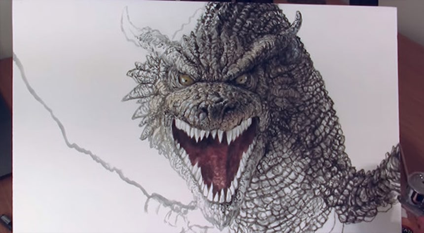 その様子を10分間のタイムラプス映像にしてYOUTUBEで公開中だ。白い紙にドラゴンの魂が注ぎ込まれ、灰色の線と線が折り重なり、着色され、最後は紙の中から飛び出しそうな勢いでこちらを見ている。