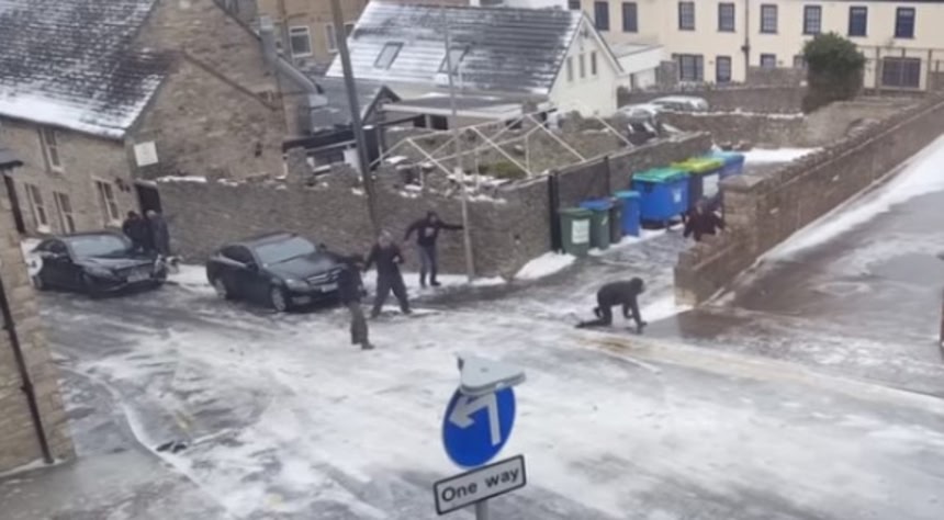 今月初め、ひどい寒波が到来したようで、イングランド南西部ドーセット州にある海岸に面した町、スワネージの坂道は完全凍結。人々はなんとか坂を上ろうとするのだが、どうしてもすべって上ることができない。で、負の連鎖が巻き起こっていくのであった。
