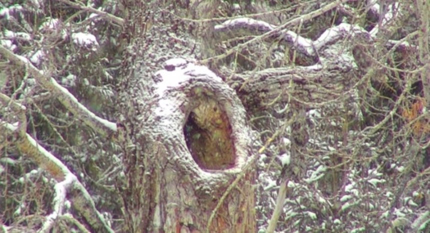 幸せそう。二股の太い枝が折れてできたウロなのかな。まだ雪降ってて寒いんだね。