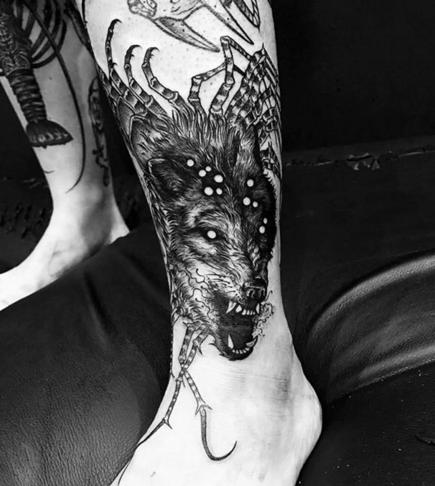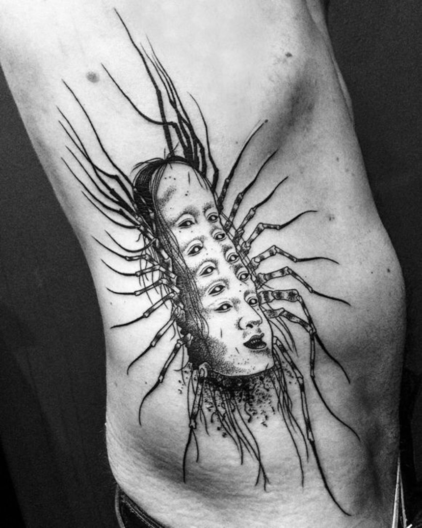彼はエイリアンのの造形デザインで知られているH・R・ギーガーからインスピレーションを得て、さらに独特のテイストを加えたクリーチャー感漂うタトウを手掛けている。