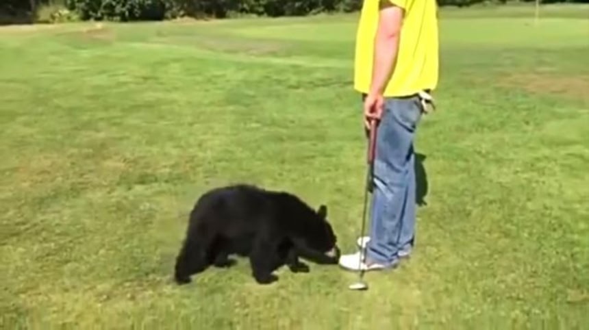 この画像を大きなサイズで見るある晴れた穏やかな午後、いつもの仲間といつものゴルフ場で、のんびりとゴルフを楽しんでいたら、突然予想もしなかったお客さんがやってきた。走ってきたのは1頭の子グマ。子供とはいえ野生の猛獣。ビックリしないわけがない。いったい何が起ころうとしているのか?