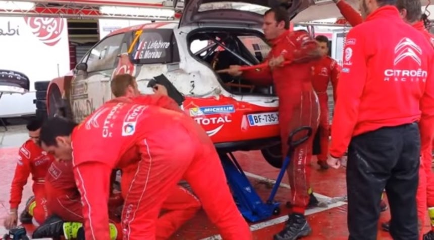 ドライバーはフランス出身のステファン・ルフェーブル。車はシトロエン・DS3 WRCである。もはや走っているのが不思議な状態でピットインした車。