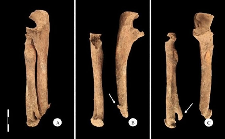 詳しい検査からは、骨の先端に生物力学的圧力が加わっていた証拠が見つかっている。骨の端に仮骨が、尺骨には骨棘が形成されているのだ。