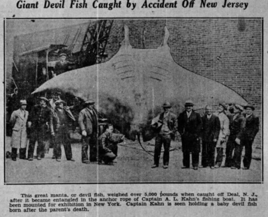 カーン船長は確かにニュージャージーの海岸で巨大なオニイトマキエイを釣り上げた。だが、写真に写っているのはエイの剥製版だ。