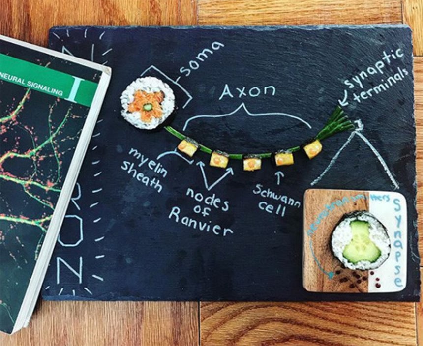 彼女は自身のイスタグラム the_sushi_scientist で、マグロ、アボカド、カニといった色鮮やかな食材のスシを使って、神経科学から地質学までさまざまな分野のトピックを視覚的に説明している。