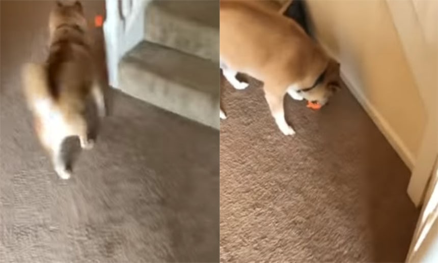 どうやらボールめいたものなのだが、それを投げたら柴犬はそそくさと追いかけていった。そこで飼い主は柴犬に声をかける「新しいオモチャ気に入った?」