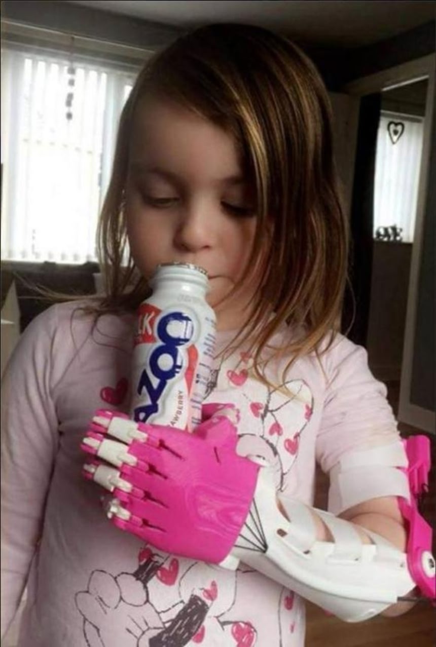 今ではお気に入りのピンクの新しい腕で、ミルクシェイクを握ることや物を拾うことができるのだ。