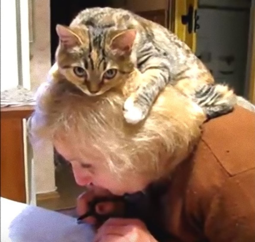この画像を大きなサイズで見る飼い主が席を立ちあがっても頭の上から降りようとしない猫。でもって、猫が頭に乗っていることをまったく意に介さない女性。というか猫が乗っている事実すら気が付いていないのかも!?