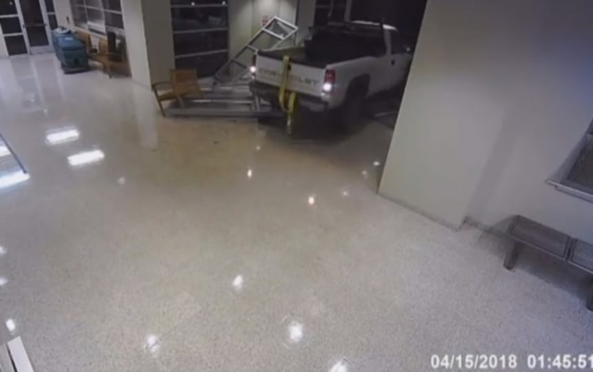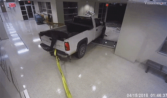 この画像を大きなサイズで見るアメリカ、テキサス州パサデナ裁判所にあるATM(現金自動預け払い機)を機器まるごと盗み出そうとした2人の窃盗犯グループによる犯行現場の一部始終が監視カメラに記録されていた。