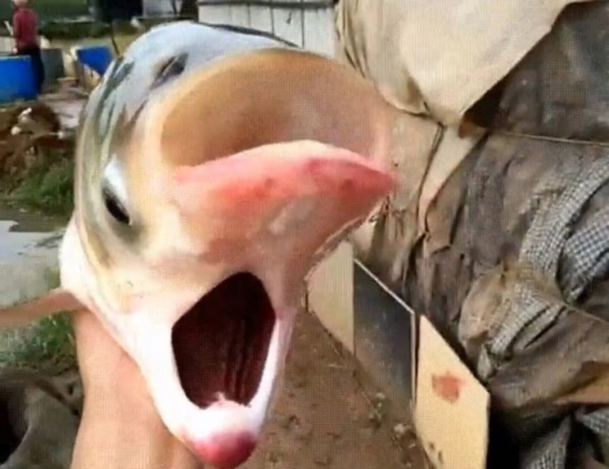 生物学者の解説によると、この魚はコイであるという。具体的にはコクレンかハクレンとのこと。普通の状況なら以下の写真のような姿となる。