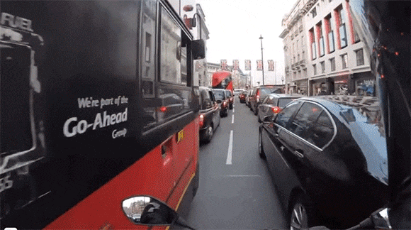 イギリスの交通量の多い道路で車の間を潜り抜けるようにして走っていたバイカー。見ているだけでハラハラなのだが、案の定、危機一髪の瞬間があったようだ。