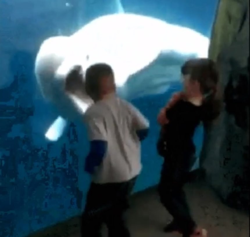 おまえらなんかいつだってヤレるんだぜ的なアピールなのか、たじろぐ子供たちの姿を面白がっているのかはわからないが、シロイルカのマウントの取り具合が面白い。