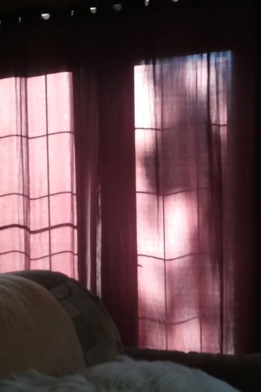 その夜、ミシェルさんがリビングルームにいると、カーテン越しに奇妙な影が写っていることに気が付く。最初は目の錯覚かしら?それとも見間違いかしら?と思ったそうだが、そのうちにピンときたという。
