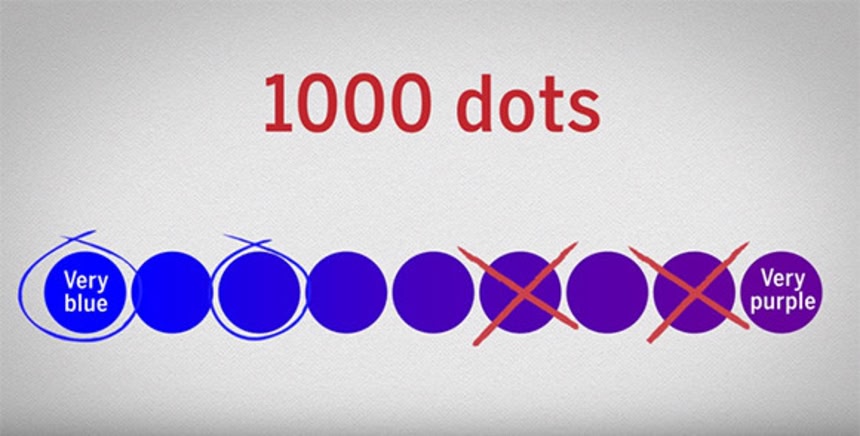 色覚異常のない参加者に”かなり青い”ものから”かなり紫”までの色の範囲を持つ1000個の点を見せて、それが青かどうか答えてもらうという実験だ。
