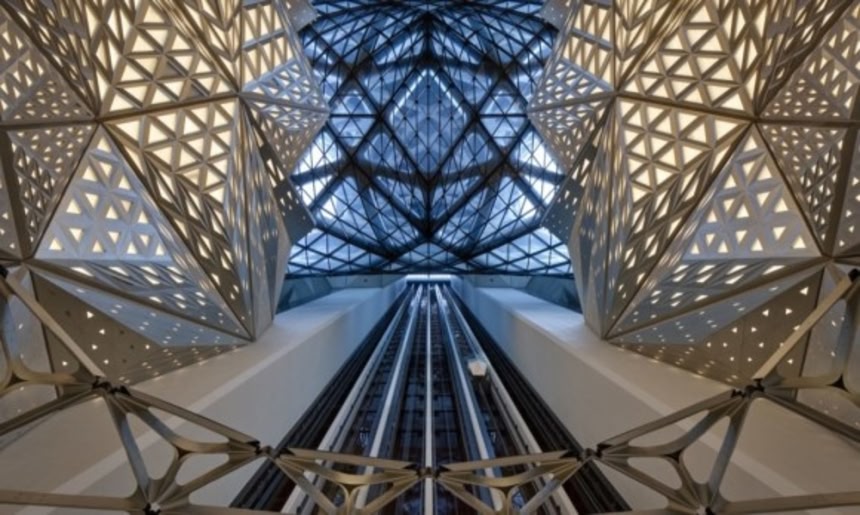 透かし編みのような外骨格に覆われた独特のデザイン。このホテルは才能を惜しまれつつ世を去った建築家、ザハ・ハディッドの設計を実現したものだ。