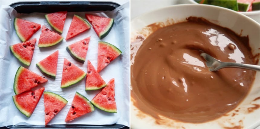 こうすることで、チョコを固まりやすく、パリっとした食感に仕上がるよ。おいしくてクセになる、スイカとチョコ&塩の組み合わせ。