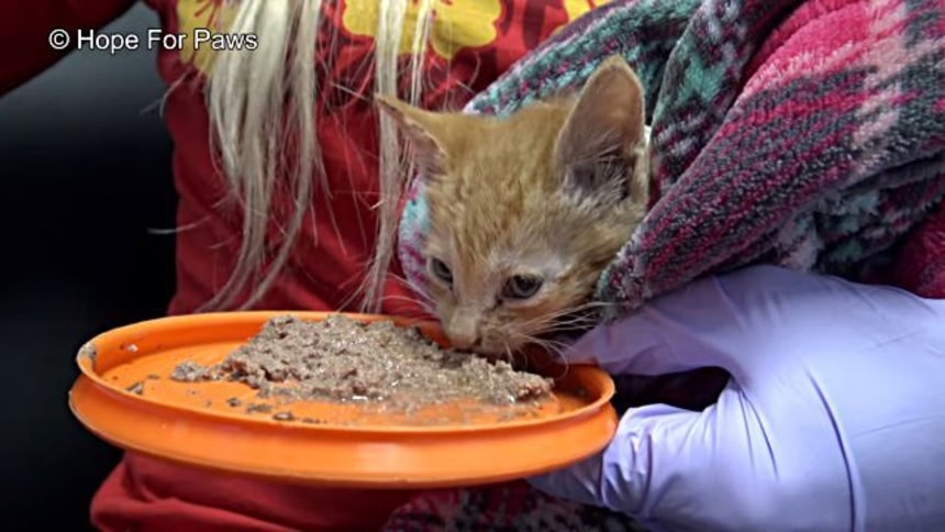 この画像を大きなサイズで見る飲まず食わずで72時間以上頑張った子猫。すぐにキッチンで砂糖水を与えたあと、救急病院へと搬送し、手当てを受けることに。