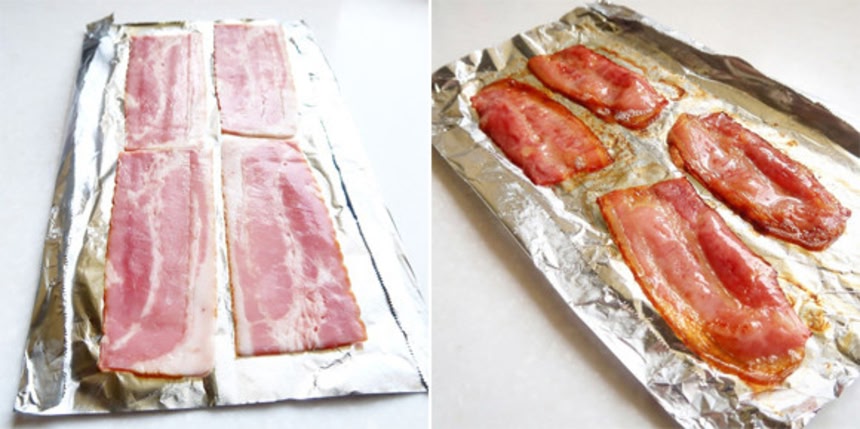 この画像を大きなサイズで見る・アルミホイルの上にベーコンを敷き、トースター750wで7分ほど焼き取り出しておく。