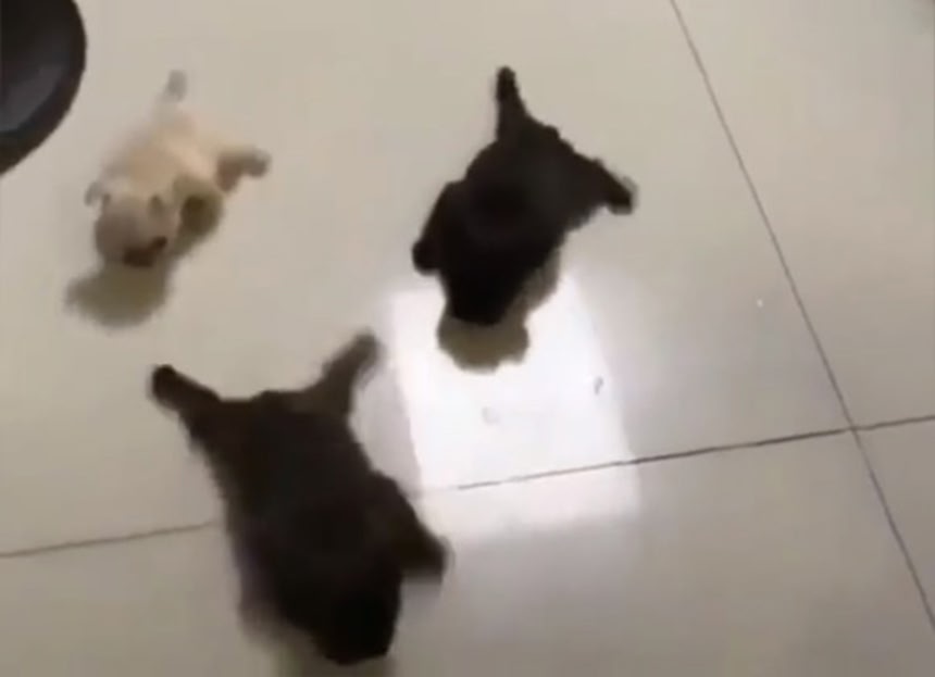 まだ小さな子犬の赤ちゃんズ。全部で3匹いるようだが、同じ方向にむかって一斉にスタートしたようだ。