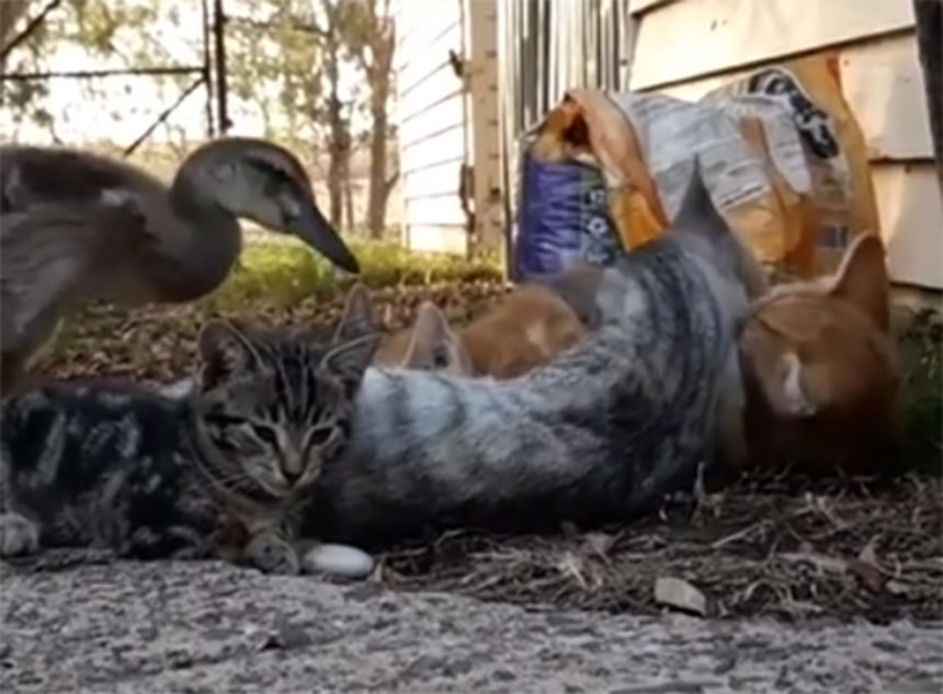 ・この後、子猫とカモに大きな友情が芽生えた。子猫は大人になり、持ち前の狩猟本能でカモを狩ろうとした。が、その時「覚えてますか?あの時仲間に入れてもらったカモです」と言われハッとあの時のやさしい空気がよみがえる。「そうか。あの時の…」空腹の猫はそのまま立ち去っていったという(脳内妄想)