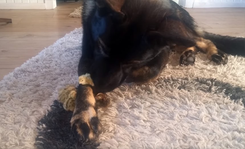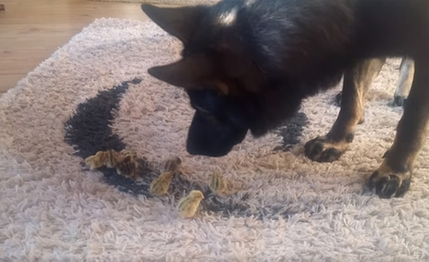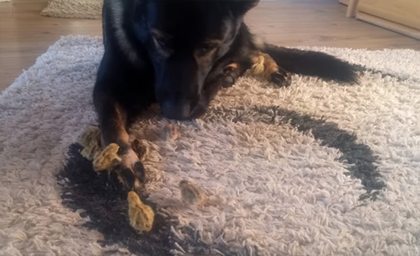 一瞬ドキッとする光景だが、ジャーマンシェパードのトーリンは、ウズラのヒナたちに出会った瞬間、そのニオイをやさしく嗅ぎ取り、近づいてくるヒナたちに大きな懐を貸してあげるのだ。