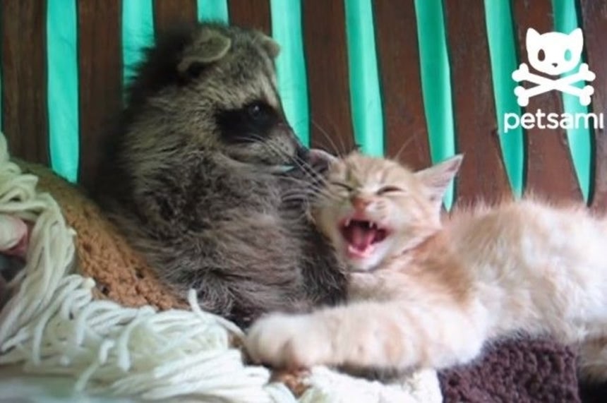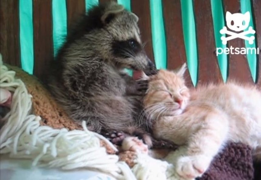 この画像を大きなサイズで見る異種動物を多頭飼いしているおうちも多いと思う。こちらの動画のお宅でも、アライグマとにゃんこが仲良く同居しているみたい。