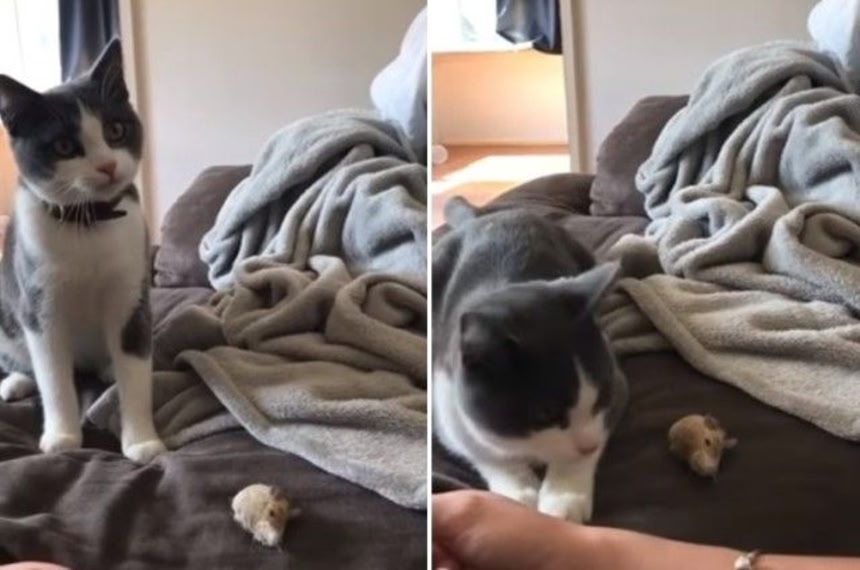 この画像を大きなサイズで見るおおっと、飼い主さんが放り投げたネズミに、猫まっしぐらだ!