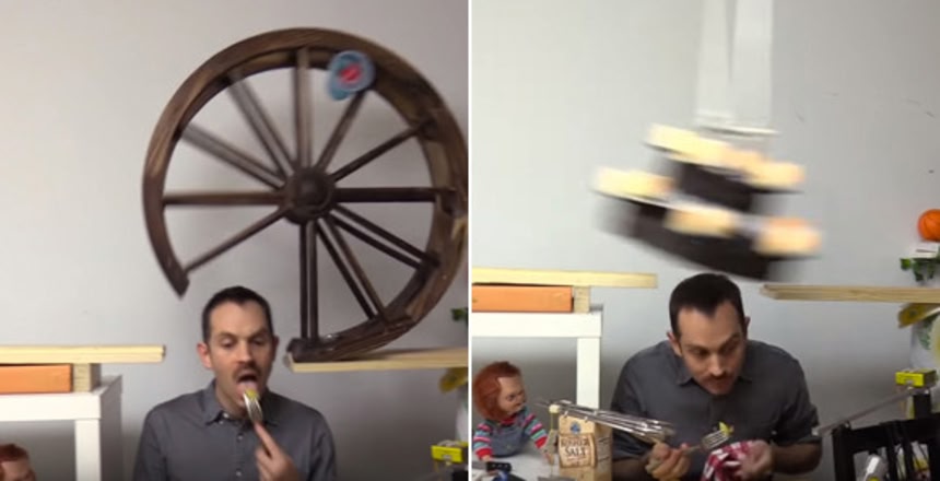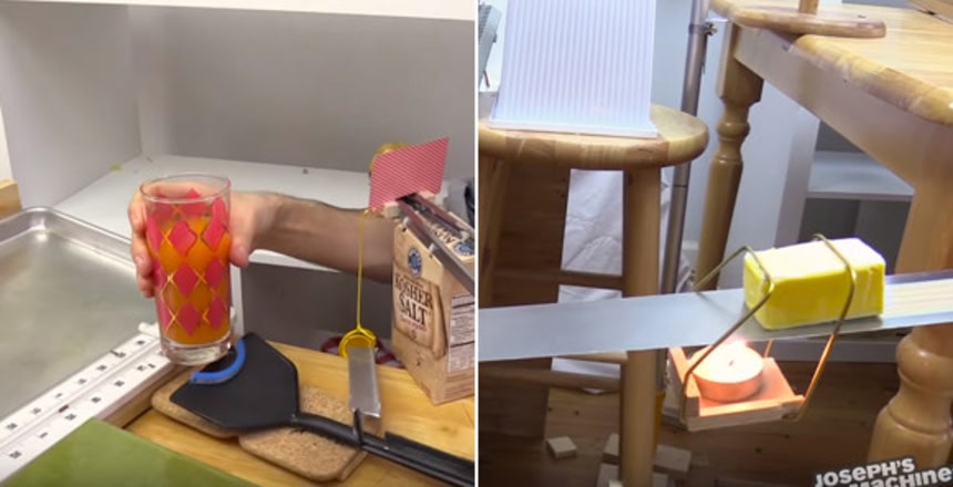 この画像を大きなサイズで見るジョセフさんは、夕食のデザートの待ち時間が嫌いだった。それですぐデザートが食べられるように、3カ月かけてこの仕掛け(ルーブ・ゴールドバーグ・マシン)を作ったそうな。