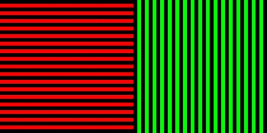 この画像を大きなサイズで見る水平の縞模様の白い部分が緑っぽくに、垂直の縞模様の白い部分が赤っぽく見えるはずだ。